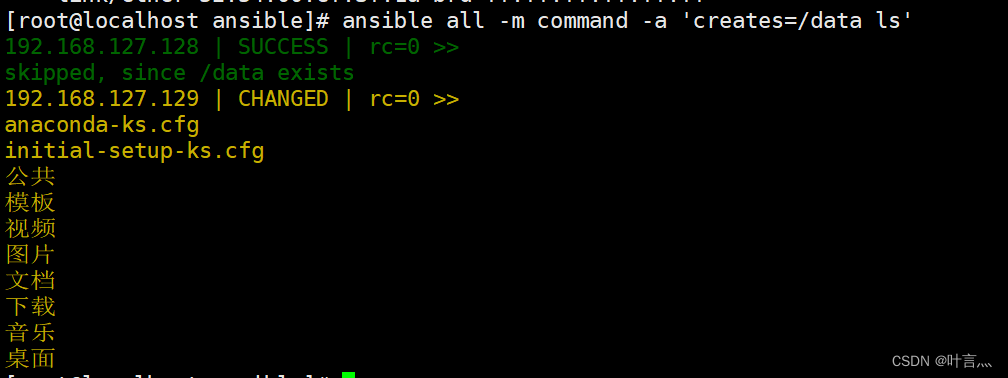 使用 command 模块在远程主机中执行命令时,不会经过远程主机的 shell 处理,在使用 command 模块时,如果需要执行的命令中含有重定向、管道符等操作时,这些符号也会失效。