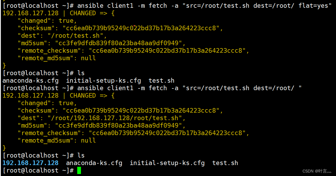 - ansible client1 -m fetch -a "src=/root/test.sh dest=/root/ flat=yes"