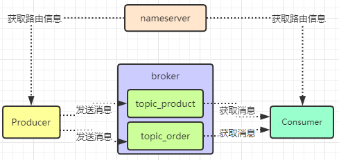 刚才的图就是一个双master的主从架构,那生产者发送消息的时候,怎么知道应该发送到哪个机器呢?其实生产者它首先会跟nameserver通信、获取topic和broker信息,然后就按照一定的规则发送到某个broker里面去。