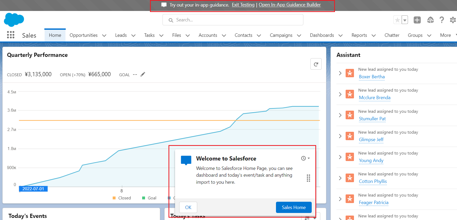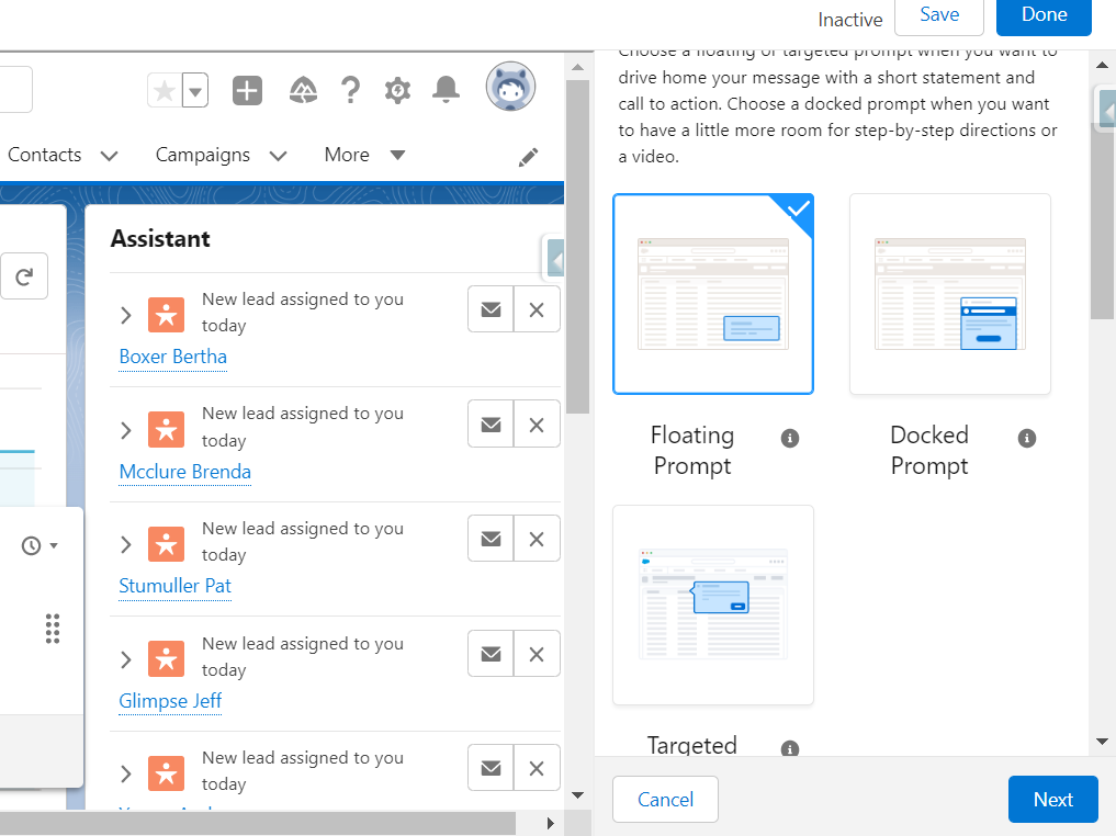 Targeted:可以把目标提示放在可定位的页面元素上。通过在元素周围的12个位置中进行选择,进一步定制相对于你所选元素的位置和排列。或者使用智能定位,让Salesforce根据用户的页面配置来确定最佳位置。下图是 Targeted的demo。