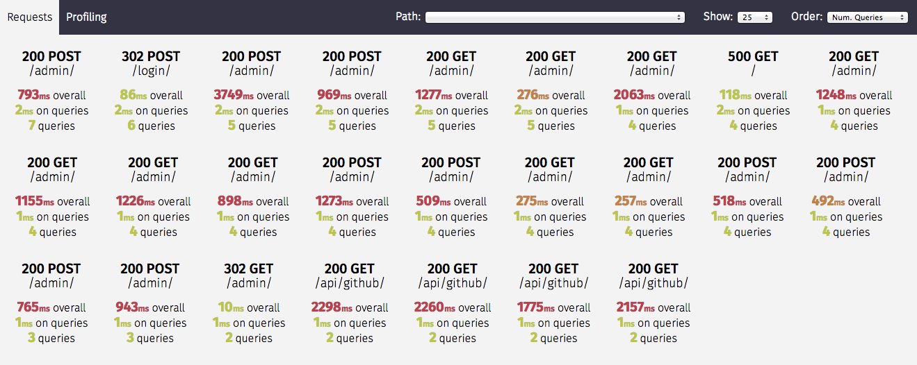 30、django-silk:Django 的性能分析工具。它可以将 Django 服务的平均耗时、请求次数、查询 SQL、代码性能分析等信息展示到一个页面,开发者有了这些信息就能够更快地找到 Django 服务的性能瓶颈和响应慢的原因。