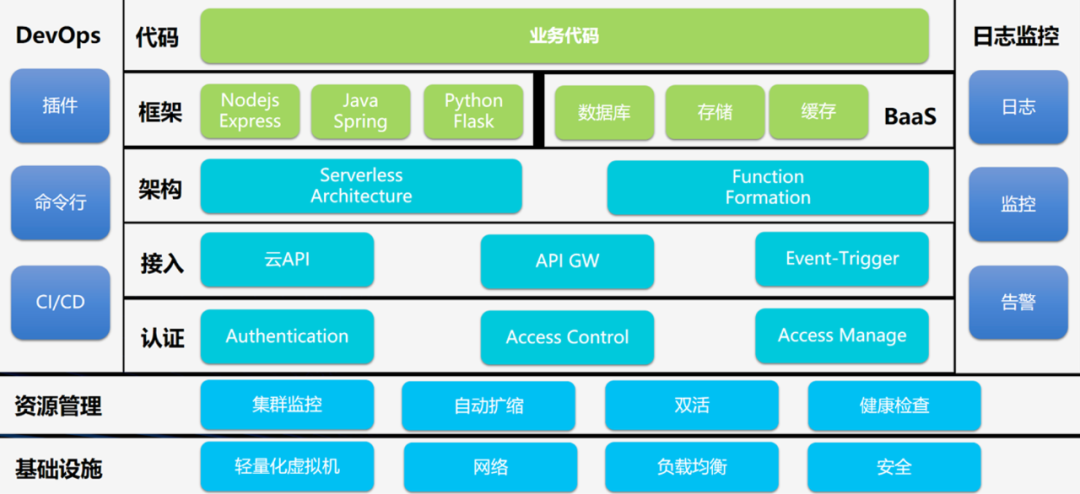 从架构层面来看,Serverless由BaaS和FaaS共同构成了完整的应用架构。Serverless计算平台可以帮助开发者完成构建服务运行环境,开发者无需购买服务器,云厂商负责提供并维护基础设施资源和后端服务组件。Serverless架构具有自动扩缩容的特性,当应用部署后云计算平台会为Serverless应用提供足够的资源来支持应用稳定运行。