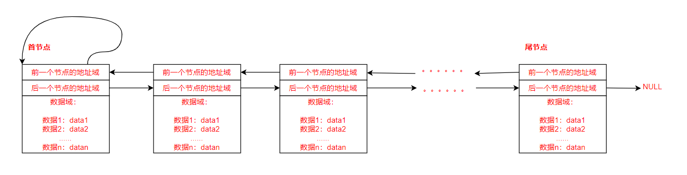 双向循环链表是头结点的前一个指针指向尾结点的地址,尾节点的后一个指针指向头结点的地址所在,从而构成一种链式的循环结构。示意图如下: