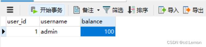 insert into `t_user`(`user_id`,`username`,`balance`) values (1,'admin',50);