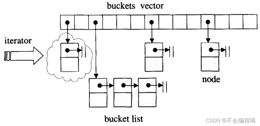 hashtable中的bucket所维护的list既不是list也不是slist,而是其自己定义的由hashtable_node数据结构组成的linked-list,而bucket聚合体本身使用vector进行存储。hashtable的迭代器只提供前进操作,不提供后退操作