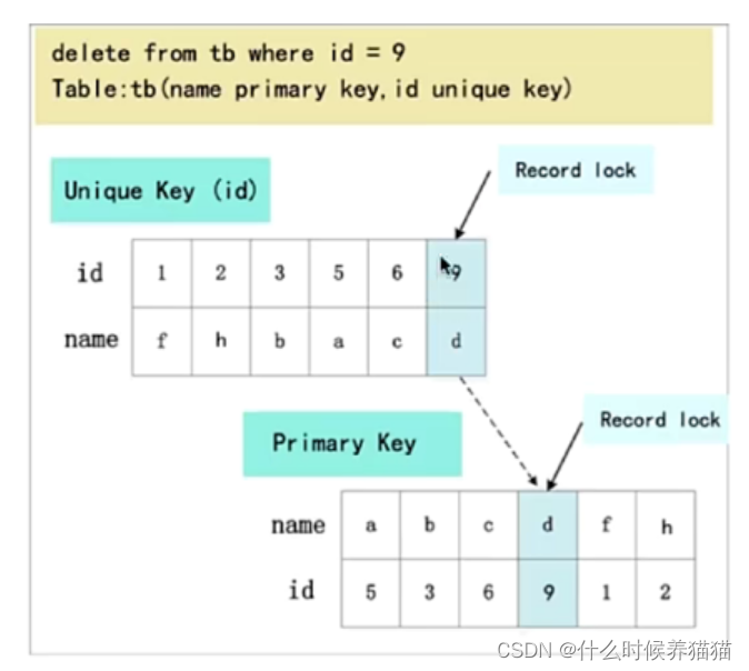 此时,由于ID是unique索引,因此delete语句会选择走ID这一列的索引进行where条件的过滤,再找到ID=9的记录之后呢,首先会将这个unique索引上的ID为9的索引,加上行锁recollect,同时会根据读到的这个name类回主键索引及我们的密集索引,将这个密集索引上的这个name=d对应的主键索引项也加上一个recollect,也就是排它锁。