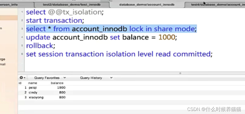 - select * from account_innodb lock in share mode;//当前读,读取事务最新更新的数据,即添加了一个贡献读锁。