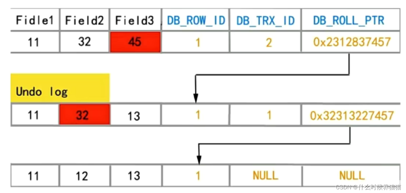 假如数据库中还有其他事务在用快照读读取该日志记录,那么对应的undo log还没被清除,此时某个事务又对同一行数据进行修改,这里将fields3改为了45,这时又多了一条undo日志