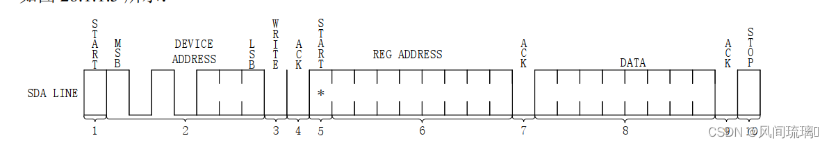 xxx_read_regs 函数用于读取 I2C 设备多个寄存器数据,然后定义了一个i2c_msg 数组, 2 个数组元素。如图,I2C写时序图,因为 I2C 读取数据的时候要先发送要读取的寄存器地址,然后再读取数据,所以需要准备两个 i2c_msg。一个用于发送寄存器地址,一个用于读取寄存器值。