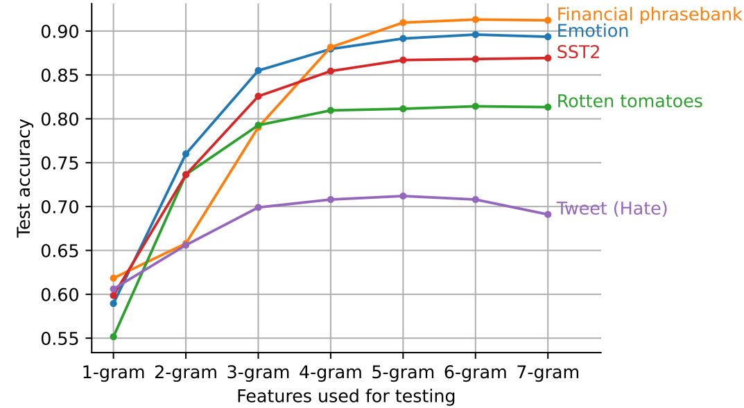 下图显示了使用 4-gram 拟合的 Emb-GAM 模型(使用微调的 BERT)的准确性。因为仅用于测试的 ngram 的顺序是不同的, 随着用于测试的特征数量的增加,性能趋于提高,但解释变得更加困难。