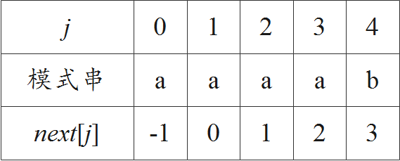 例如,针对模式串"aaaab",其相应的next数组值为“-1 0 1 2 3”。则据next数组的作用易知,当 T[3]=a 与主串 S[pos] 失配时,则会使用 T[next[3]]=T[2]=a 与主串 S[pos] 再进行匹配,显然还会失配。这是因为,T[0]~T[2]与T[3]都相等,当T[3]与S[pos]失配时,T[0]~T[2]与S[pos]必然也失配。显然T[0]~T[2]与S[pos]的比较没有意义,一定会匹配失败。针对本模式串"aaaab"而言,将会有 T[3]=a≠S[pos],T[next[3]]=T[2]=a≠S[pos],T[next[2]]=T[1]=a≠S[pos],T[next[1]]=T[0]=a≠S[pos] 等四次比较。