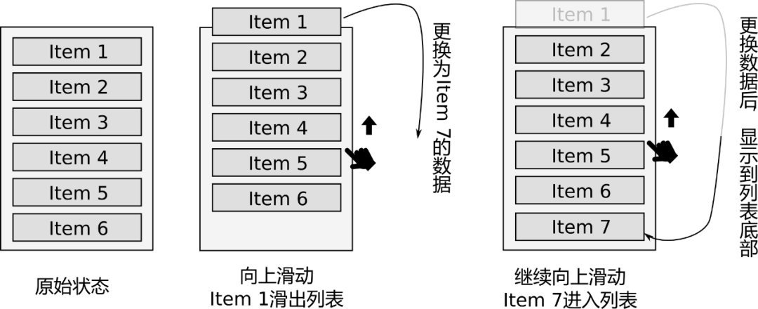 在图1中,Item 1组件被滑出列表,随后被ListContainer“换装”填入新的数据后再次从列表底部重新进入ListContainer。Item 1组件和Item 7组件实际上是1个组件,组件还是原来的组件,只不过数据已经不是原来的数据了。这种按需创建组件的思想对于应用程序能够流畅稳定地运行非常重要。这么说来,ListContainer就像一个掌管着系统资源的大臣,时时刻刻打着精细的算盘,用最少的内存资源来干更多事情。