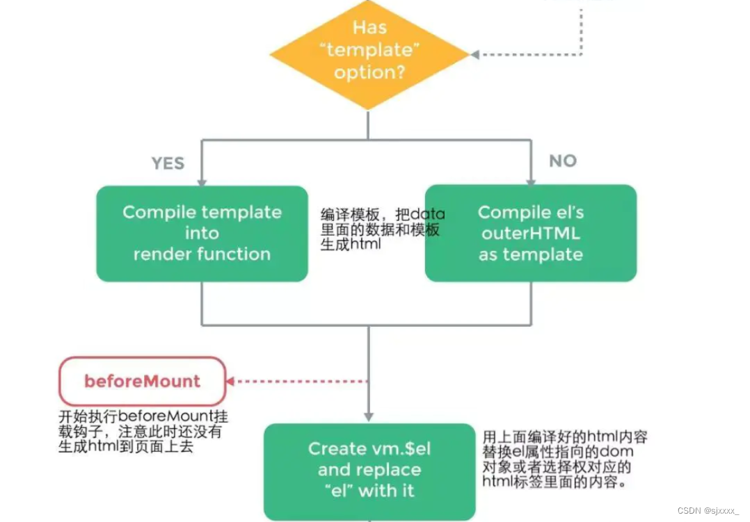 3)beforeMount钩子函数和Mounted间的生命周期:首先会判断对象是否有el选项。如果有的话就继续向下编译,如果没有el选项,则停止编译,也就意味着停止了生命周期,直到在该vue实例上调用vm.$mount(el)。但这时生成的html页面还没有挂载到el上。