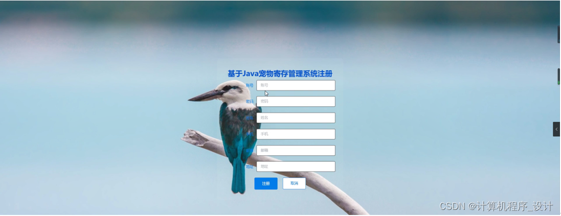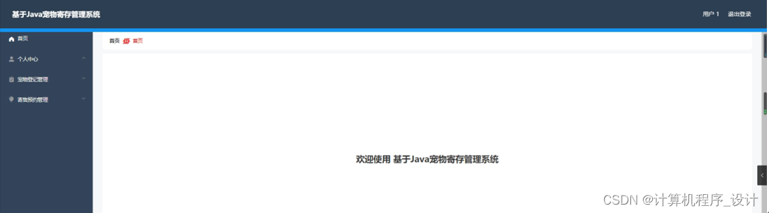 用户登录进入系统可以查看首页、个人中心、宠物登记管理、寄售预约管理等内容,并且还可以对其进行相应的操作管理,如图5-7所示。