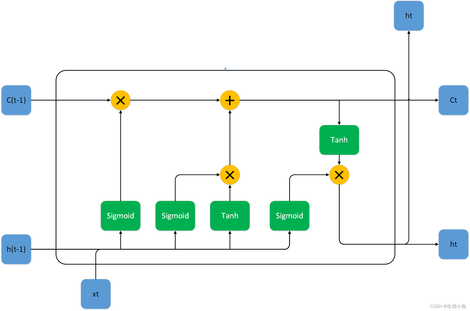 得到输入门的两个输出it、gt后,再由遗忘门得到的ft与上一时刻的状态C(t-1)进行计算,可以得到更新的状态Ct。