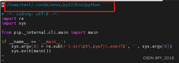 因为在主机B上Python3.7的环境是从主机A复制而来的,所以pip所指向的python的路径可能是不一样的。比如在本例中,主机A上pip的指向为下图中红框的路径:/home/test/.conda/envs/py37/bin/python