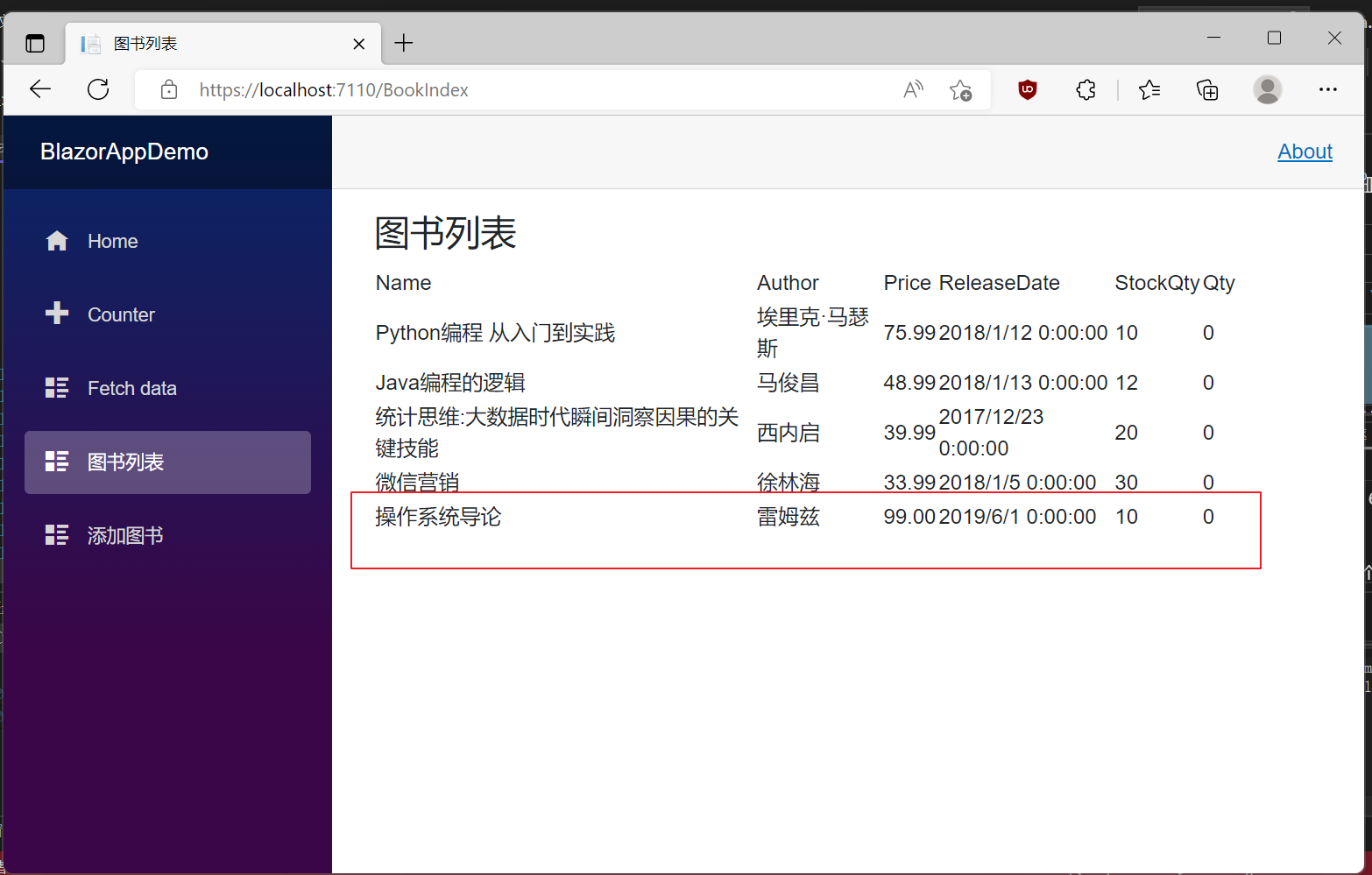 如果不存在错误,应用程序将会把我们填写的数据保存到数据库,并且浏览器会重定向到书籍列表页面,在书籍列表页面中的书籍列表中会出现我们刚才保存的数据。如下图。