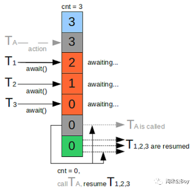 // 这也就是说,只要count == 0了,则被阻塞的线程都能恢复运行