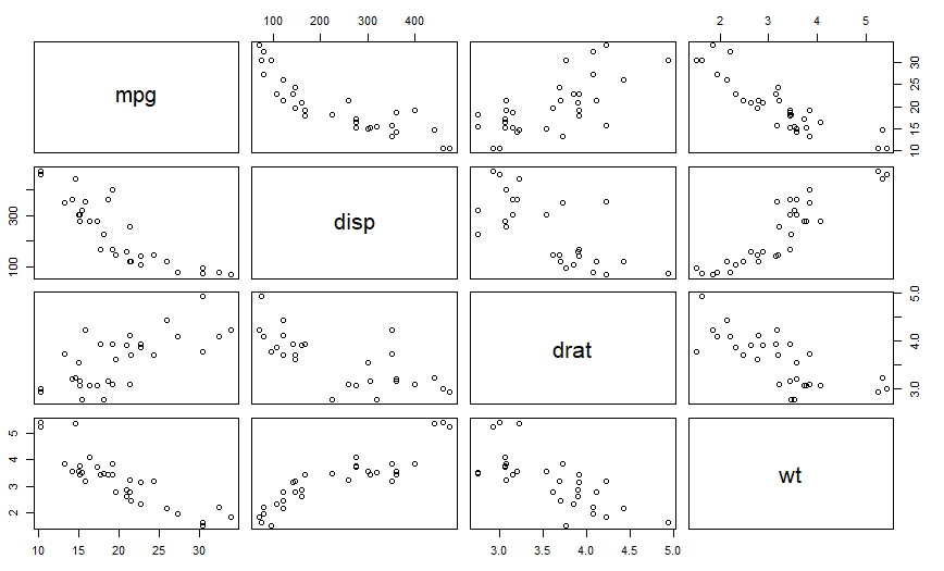 plot(~mpg+disp+drat+wt,data = mtcars)