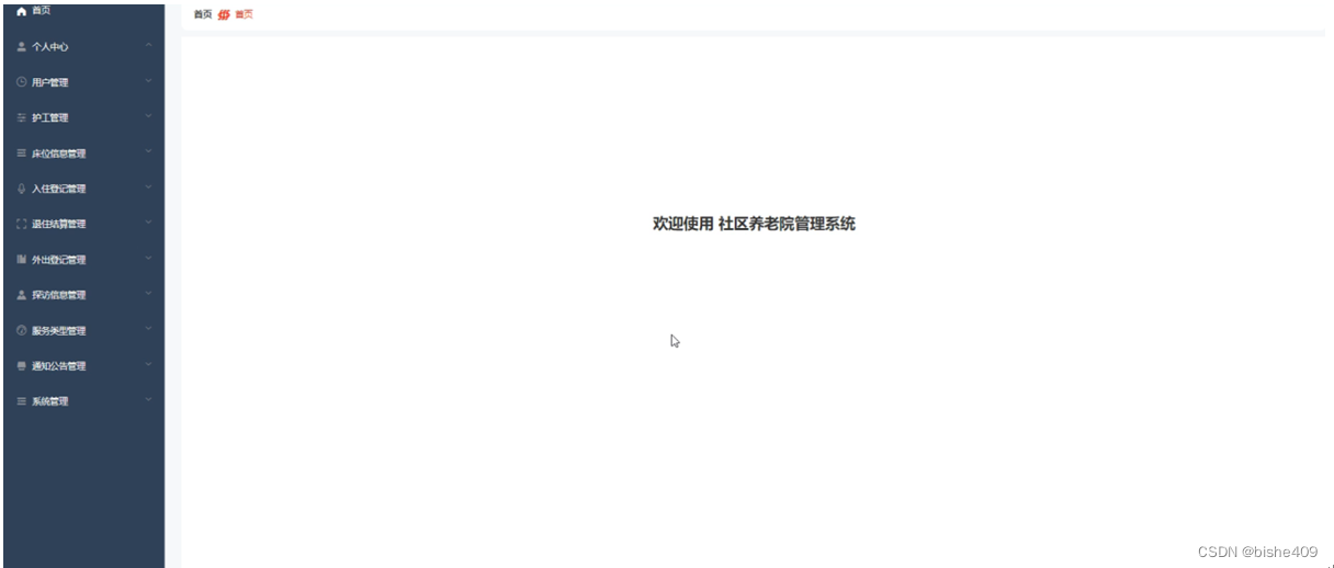 管理员登录进入社区养老院管理系统可以查看首页、个人中心、用户管理、护工管理、床位信息管理、入住登记管理、退住结算管理、外出登记管理、探访信息管理、服务类型管理、通知公告管理、系统管理等信息,如图5-7所示。