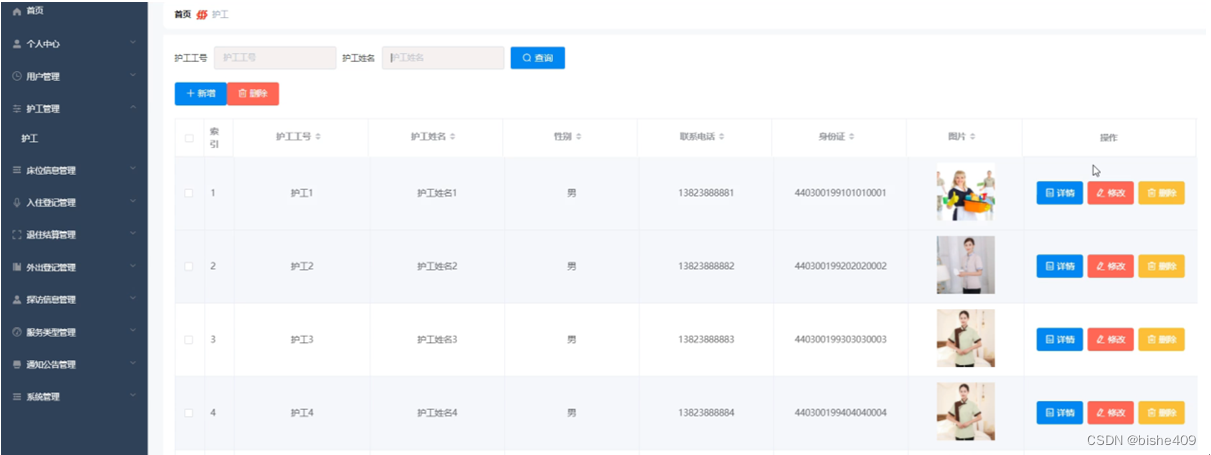 护工管理,在护工管理页面可以查看索引、护工工号、护工姓名、性别、联系电话、身份证、图片等信息,并可根据需要进行详情、修改或删除等操作,如图5-9所示。