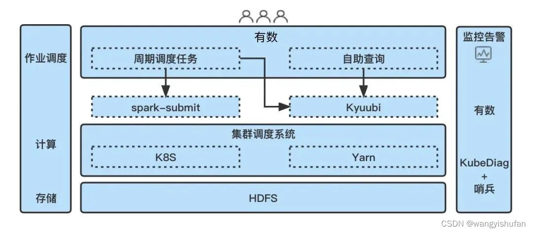 随着云原生技术的发展和成熟,大数据基础设施积极拥抱云原生是业内发展的一大趋势。网易传媒在2021年成功将SparkSQL部署到了K8s集群,并实现与部分在线业务的混合部署,到目前已经稳定运行了一年多。期间传媒联合杭研Spark内核团队和云计算团队对出现的问题进行了持续的改进,本文将对这些落地优化实践进行初步的梳理总结,希望能给大家带来一些有用的参考。目前,传媒大数据中心的大部分SparkSQL任务都已经迁移到了K8s集群,但仍有一部分算力保留在Yarn集群,作业调度主要依托于有数平台,SparkSQL任务的提交方式以Kyuubi[1]为主,Spark版本主要基于3.1.2进行演进,下图简单描述了我们当前Spark离线计算的基本架构: