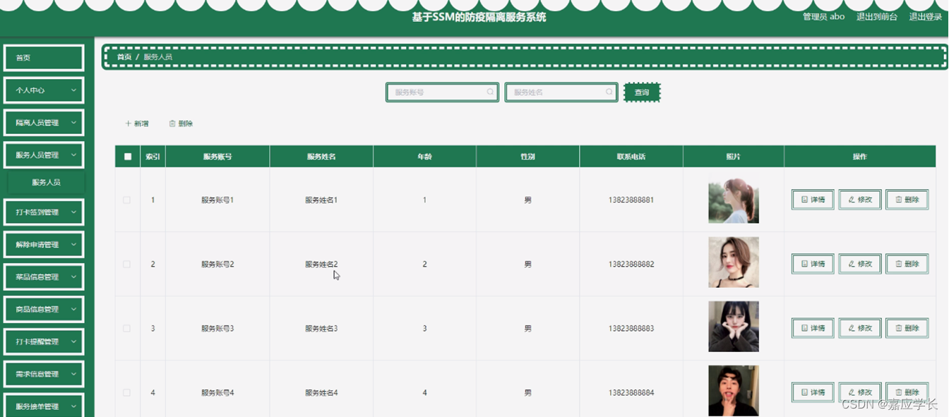在服务人员管理页面,管理员可以对服务账号、服务姓名、年龄、性别、联系电话、照片等内容进行详情、修改、删除或新增等操作,服务人员管理页面如图5-10所示。
