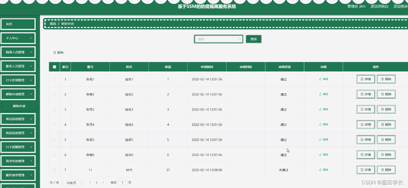 解除申请管理,在解除申请管理页面可以对索引、账号、姓名、体温、申请时间、审核回复、审核状态等内容进行审核、详情、删除等操作,解除申请管理页面如图5-12所示。