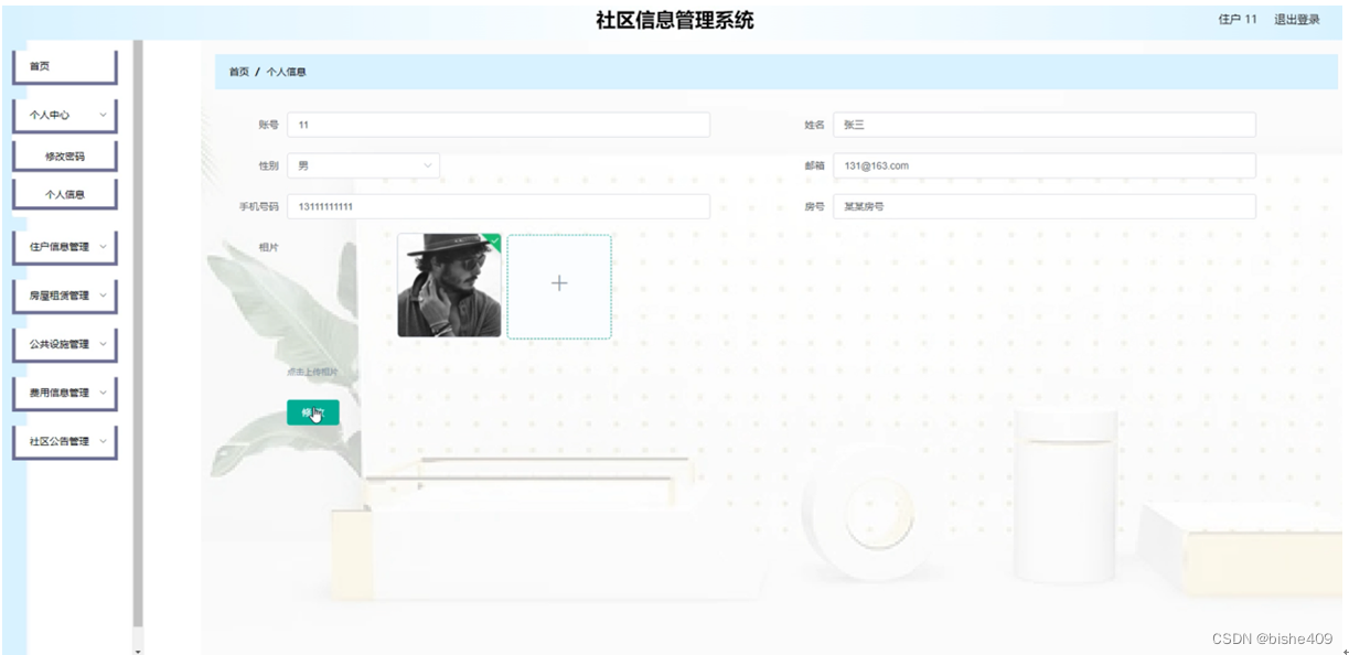 个人中心,在个人中心页面可以填写账号、姓名、性别、邮箱、手机号码、房号、相片等信息修改,并进行修改密码操作,如图5-3所示。
