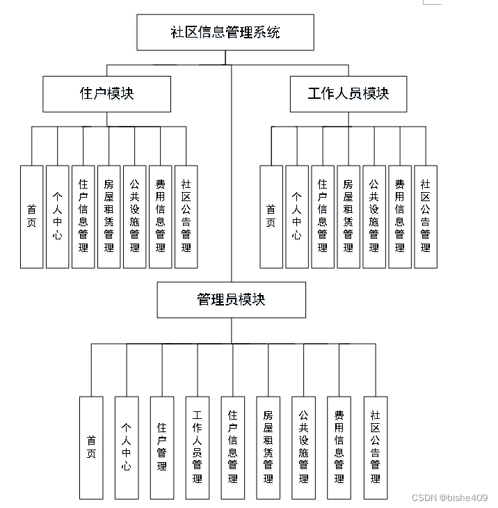 整个系统的模块划分包含工作人员管理模块、住户管理模块和管理员管理模块, 又划分了若干了子模块,为了方便更直观的理解,下图以图形形式给出关于整个网站的结构图。