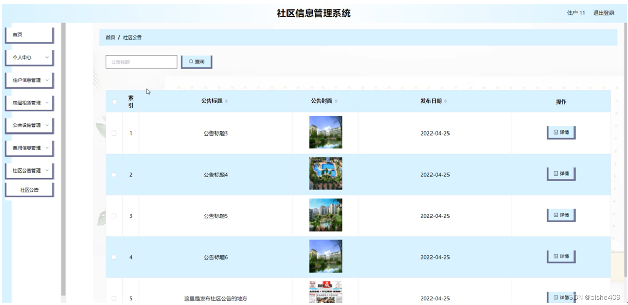 社区公告管理,在社区公告管理页面可以查看公告标题、公告封面、发布日期 等内容,并进行详情操作,如图5-8所示。