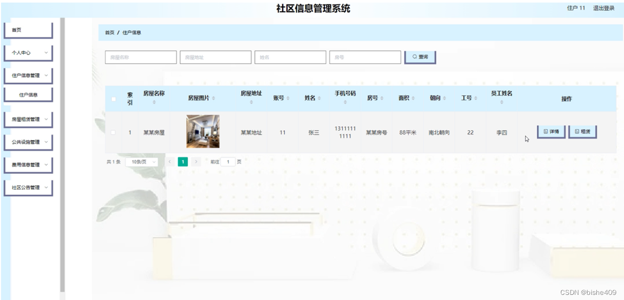 住户信息管理,在住户信息管理页面可以查看房屋名称、房屋图片、房屋地址、账号、姓名、手机号码、房号、面积、朝向、工号、员工姓名等内容,并进行详情、租赁等操作;如图5-4所示。