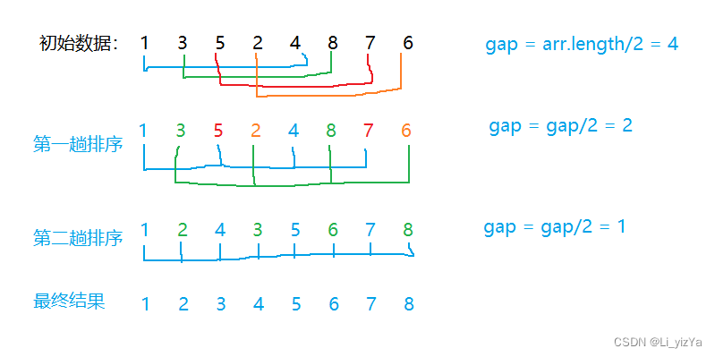 希尔排序也是一种插入排序,它是直接插入排序改进后的一个更高效的版本,也称为缩小增量法,其基本思想是:先选定一个整数d,将待排序数组中所有记录分成组,所有距离为d的倍数的记录为同一个组,先在每个组内进行直接插入排序,然后取第二个增量,一直重复上述操作,当d=1时,所有记录有序.