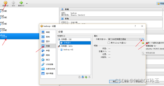 选中之前建立的hadoop,点击设置,选择存储,选择没有盘片,选择光盘图标,选择一个虚拟光盘文件。