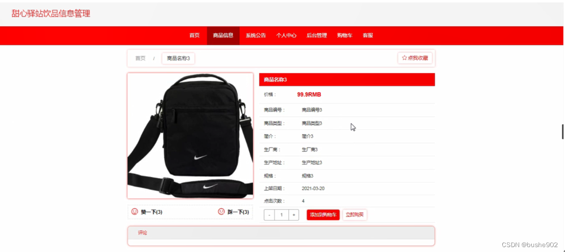 甜心驿站饮品信息管理,在系统首页可以查看首页、商品信息、系统公告、个人中心、后台管理、购物车、客服等内容,如图4-1所示。