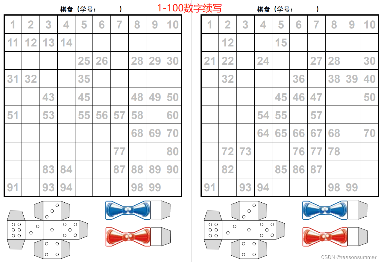 【教学类-08】“门牌号”的设计原理是对已有的Word模板内的“数字”进行随机删除,幼儿尝试补全空格上的门牌号。根据这个思路,我把代码进行调整,制作了一个《旅行棋》,主要目标是练习1-100的数字续写