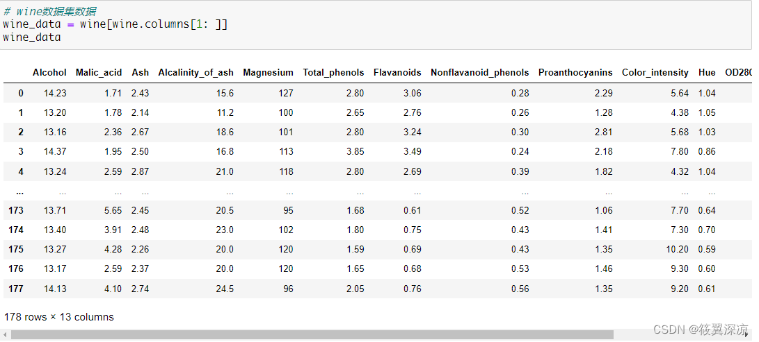 wine数据集的葡萄酒总共分为3种,通过将wine数据集的数据进行聚类,聚集为3 个簇,能够实现葡萄酒的类别划分。