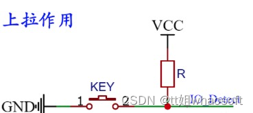上图是常用的按键检测电路,单片机的端口通过上拉电阻R接至VCC,在没有按键事件发生时单片机会检测到高电平,在按键发生时单片机会检测到低电平。上拉电阻的作用就是将端口的初始信号钳制在高电平,避免了误判的发生。