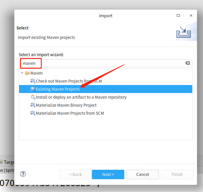 在导入界面中选择 Existing Maven Projects工程(内容太多的话可以在输入框中搜索 Maven 过滤)。