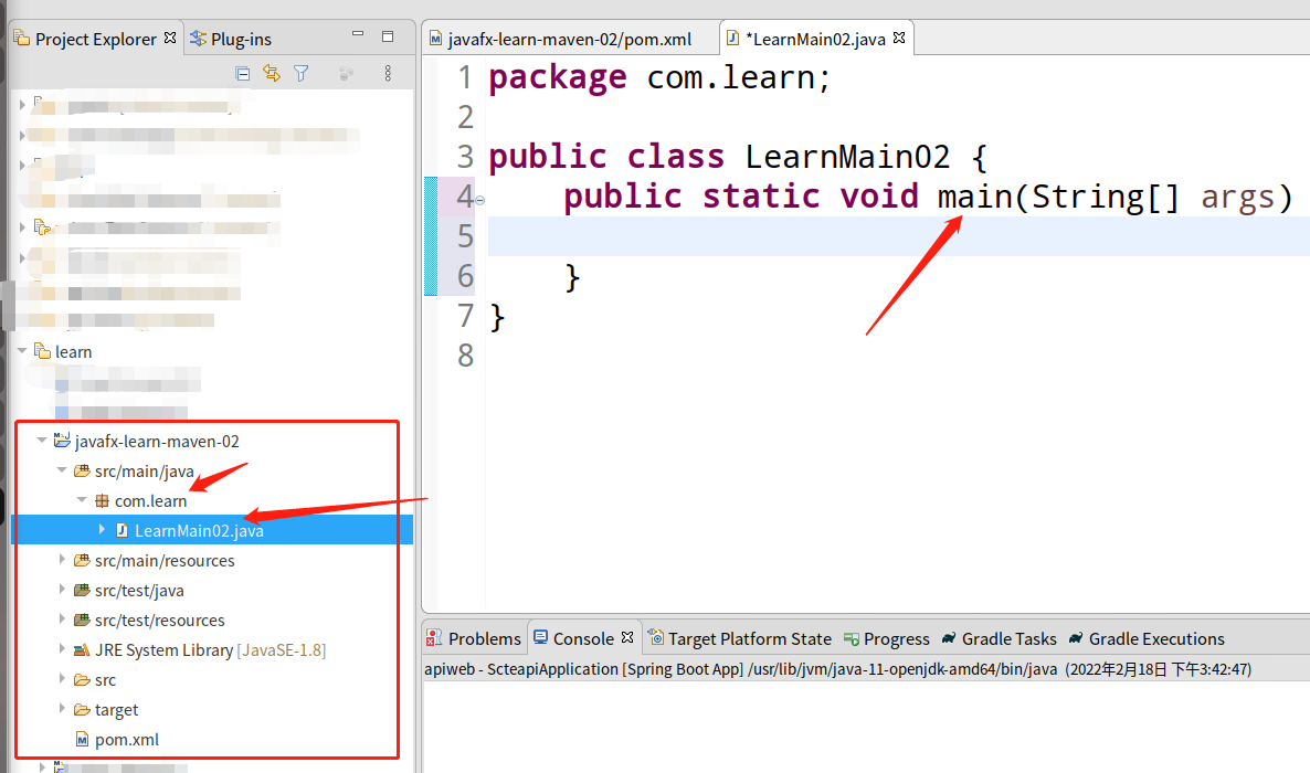 新建一个包 com.learn, 在其添加 LearnMain02 类,然后添加 main 方法。 这里主类需要和 javafx-maven-plugin 插件里 mainClass 属性配置的要保持一致。