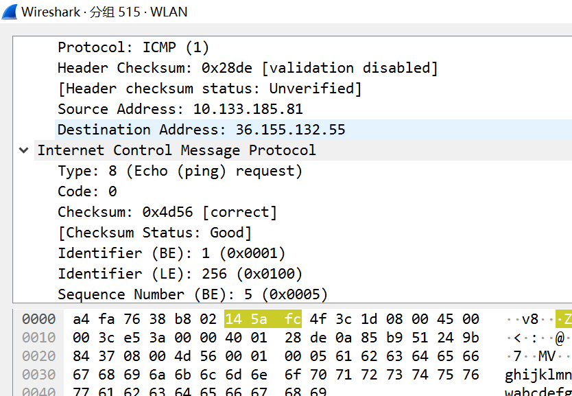 分析抓获的数据包。在这个试验中,可以发现,icmp的报文就只有两种,请求和应答: