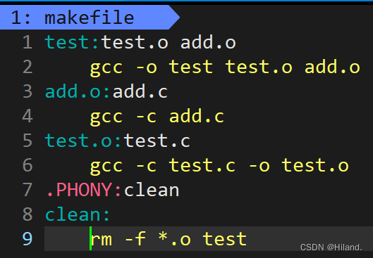 test依赖于test.o和add.o,add.o依赖于add.c并且test.o依赖于test.c,最后删除.o文件可以使用通配符*执行结果如下图: