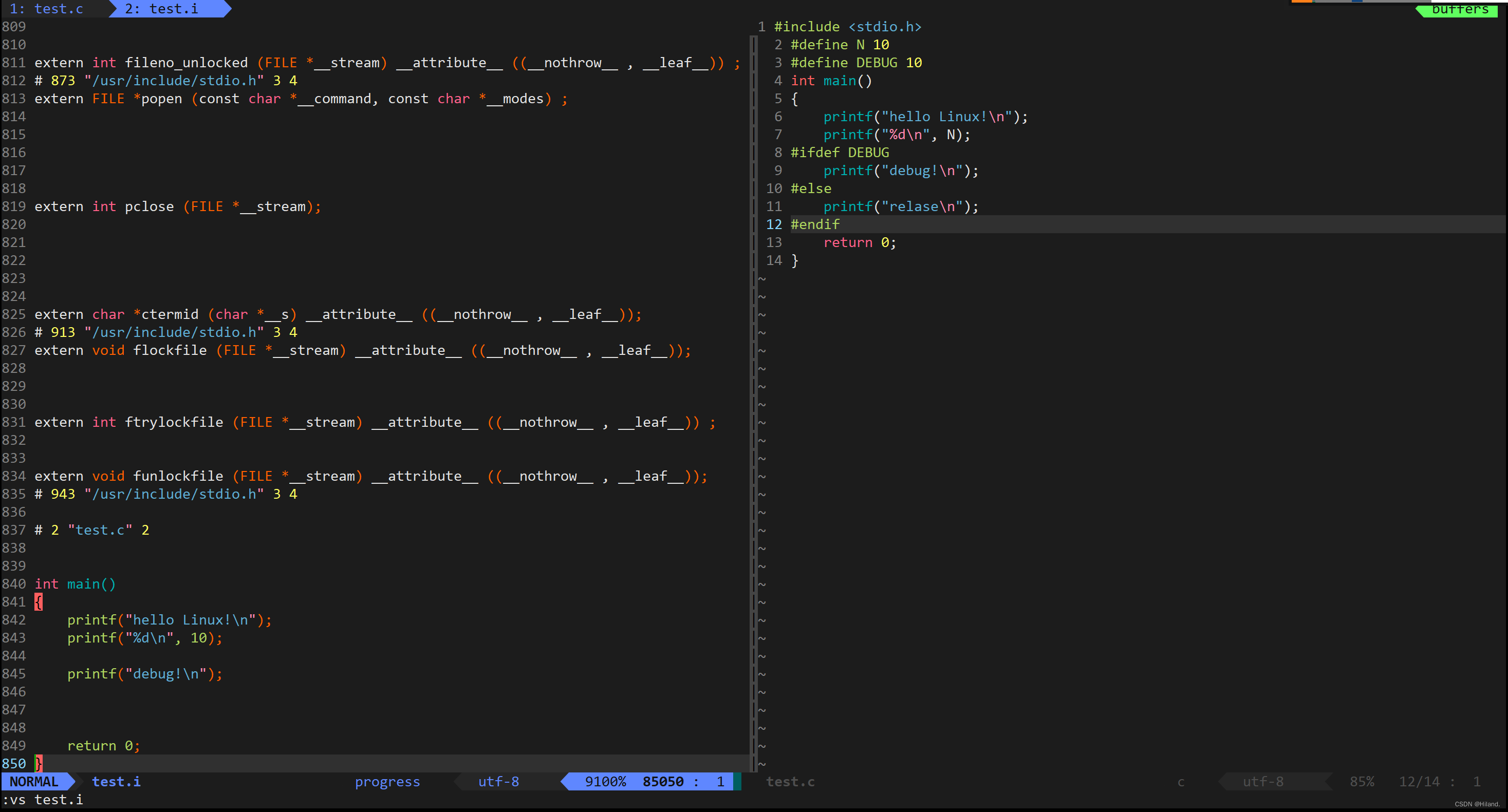 经过上述操作后会生成一个test.i的文件,我们在当前情况下,进入command输入vs test.i(vs+文件名)分屏, 再按shift+g到文本末尾