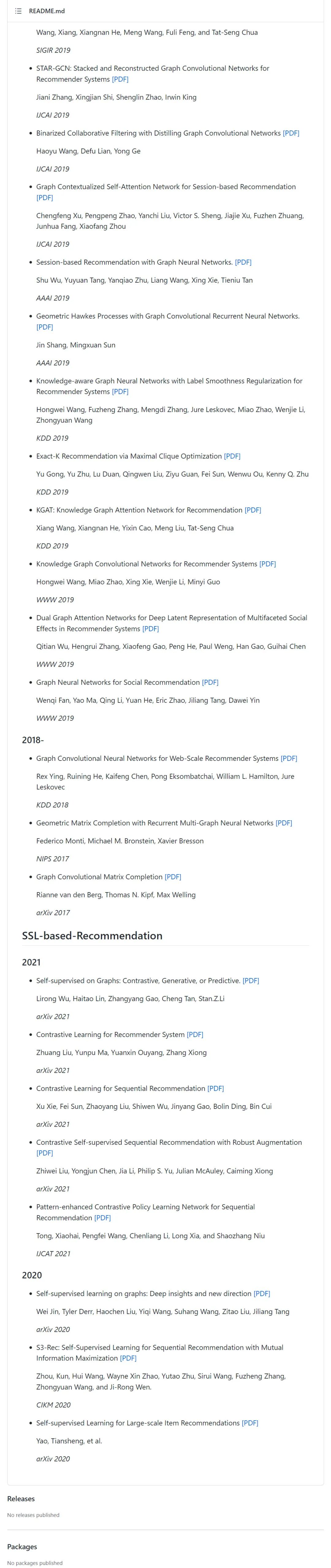 然而,SSL 在推荐领域的发展仍处于起步阶段。此外,由于用户的动态兴趣模式和项目的各种属性的复杂性,构建应用性自我监督信号可以提取更有意义的用户行为模式,并进一步有效地编码用户和项目表示。这个充满活力的研究方向被称为基于自我监督学习的推荐。本资源为读者提供了一个精选的基于图形和自监督学习的推荐资源的精选列表。