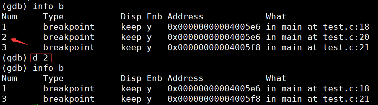 想要删除哪个断点不是看这个断点在代码中的行号,而是在断点列表的编号。这里要删除第2个断点,直接d 2即可。