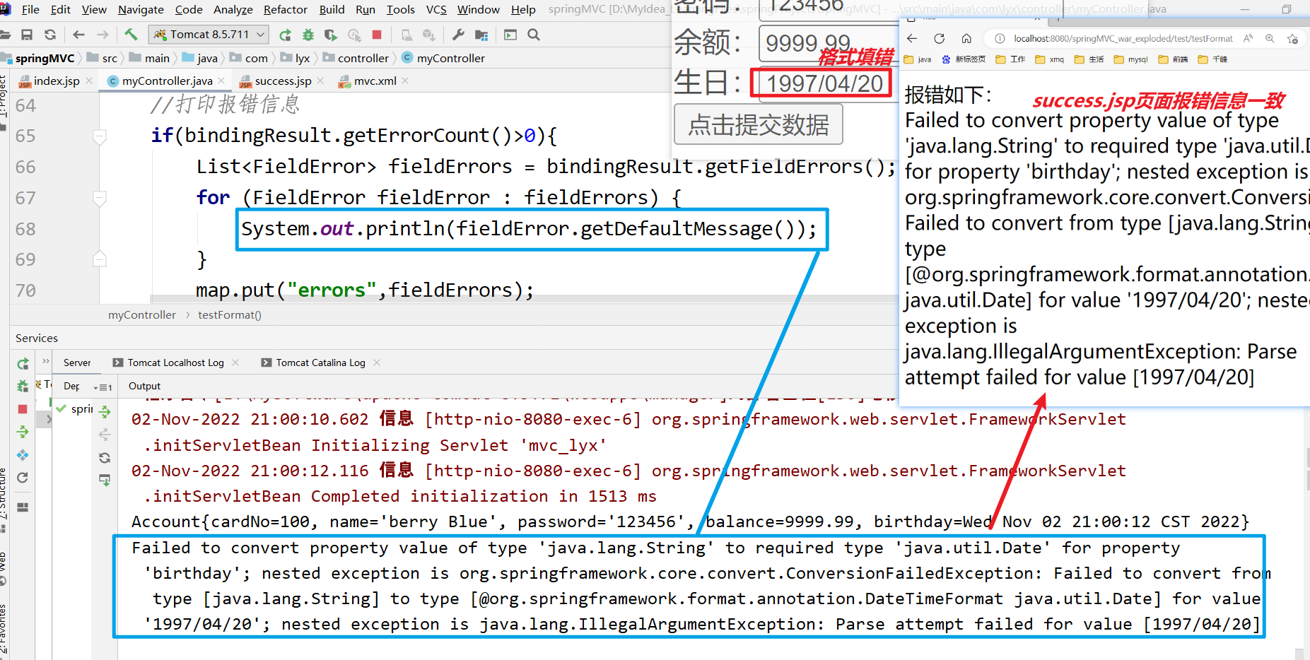 public String testFormat(Account account, BindingResult bindingResult, Mapmap) { //打印错误信息 //把错误信息放到request作用域中 }