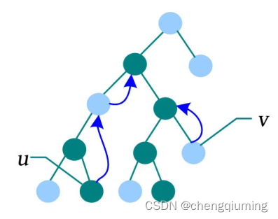 • 若 u 和 v 不在同一条重链上,则一边查询,一边将 u 和 v 向同一条重链上移。对于顶端节点深度大的节点,先查询其到顶端节点的区间,然后一边上移一边查询,直到上移到同一条重链上,再查询在同一条重链上的区间。