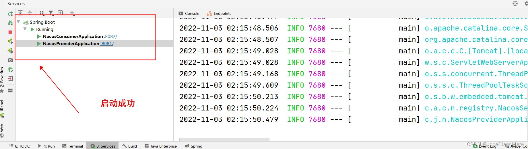 9. 启动子项目Tomcat服务器前往Nacos管理页面查看服务