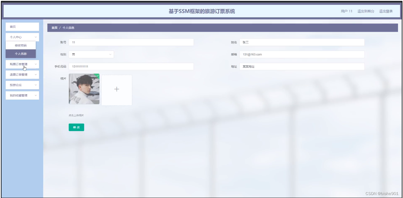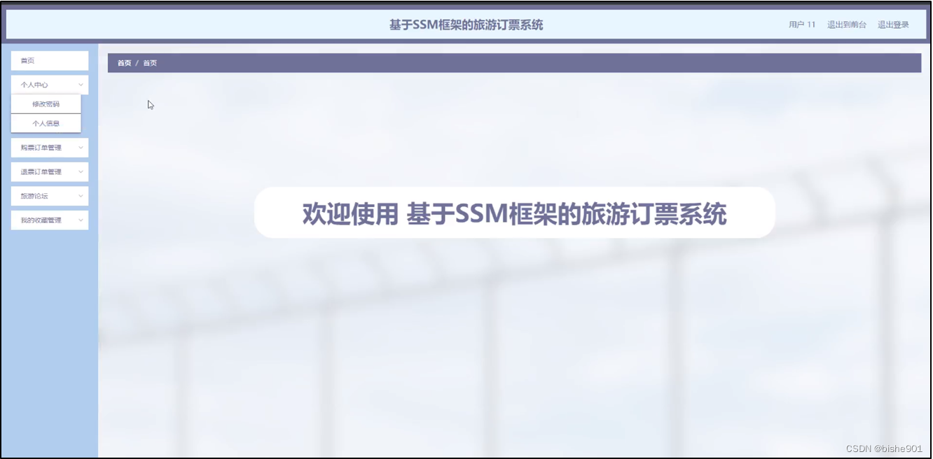 用户登录进入基于SSM框架的旅游订票系统可以对首页,个人中心,购票订单管理,退票订单管理,旅游论坛,我的收藏管理等进行相应操作,如图5-13所示。
