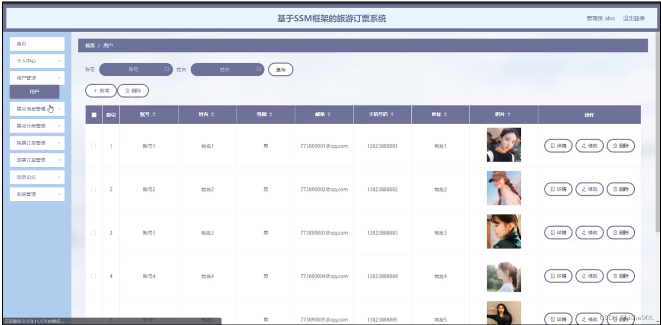 用户管理,在用户管理页面可以对索引,账号,姓名,性别,邮箱,手机号码,地址,相片等内容进行详情,修改和删除等操作,如图5-7所示。